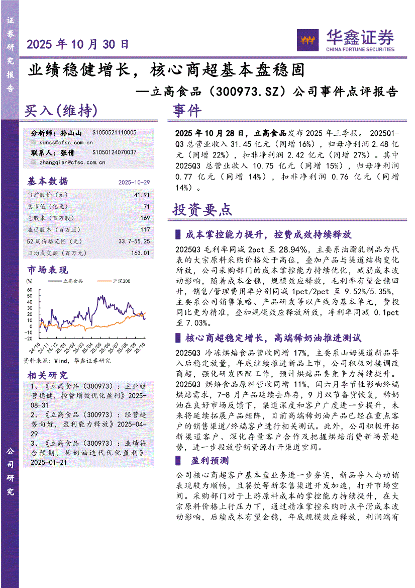 立高食品研报:华鑫证券-立高食品-300973-公司事件点评报告:业绩稳健增长,核心商超基本盘稳固-251030