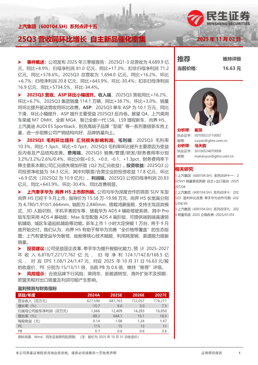 上汽集团研报:民生证券-上汽集团-600104-系列点评十五:25Q3营收同环比增长,自主新品催化密集-251102
