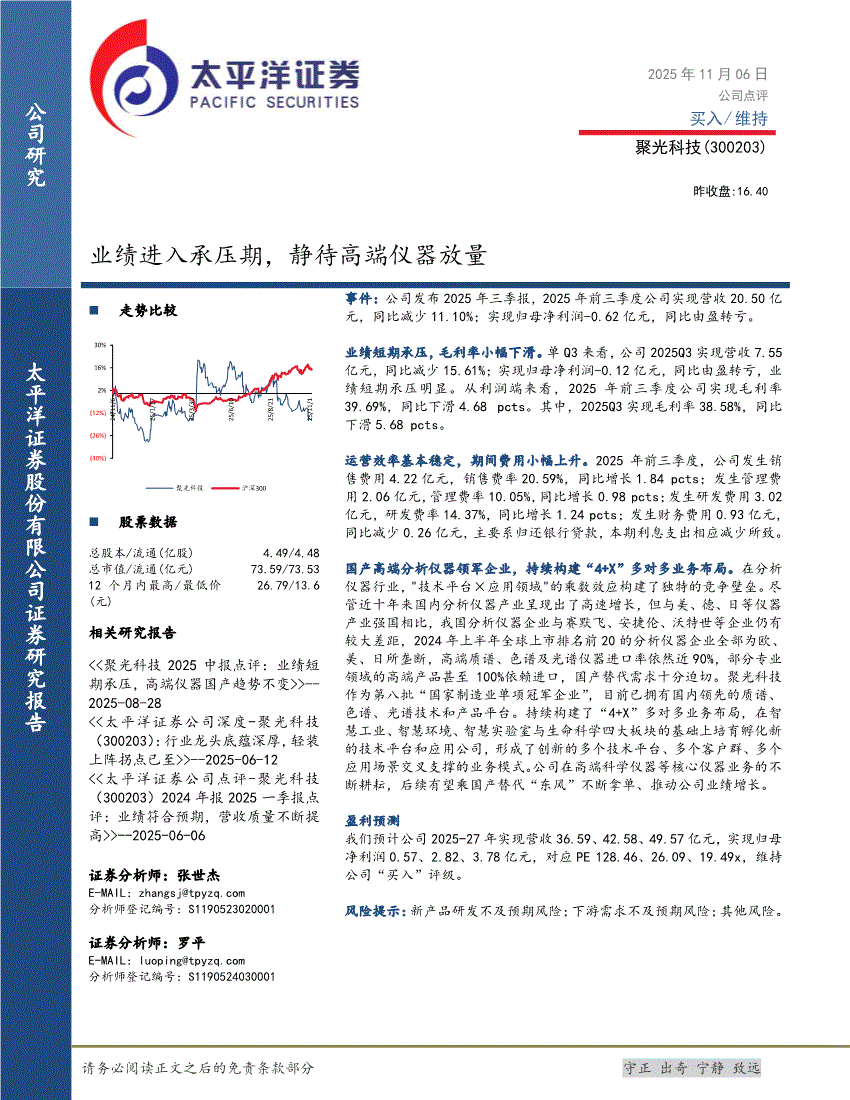 聚光科技研报:太平洋证券-聚光科技-300203-业绩进入承压期,静待高端仪器放量-251106