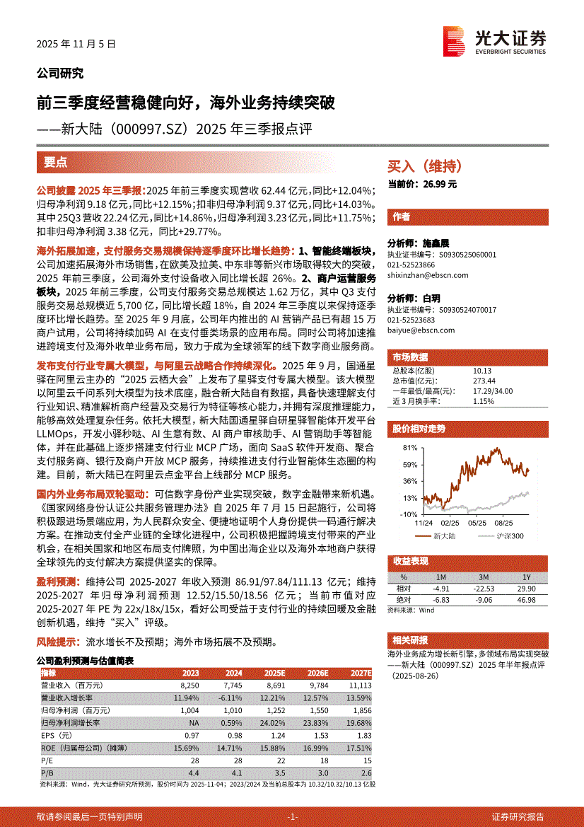 新大陆研报:光大证券-新大陆-000997-2025年三季报点评:前三季度经营稳健向好,海外业务持续突破-251105