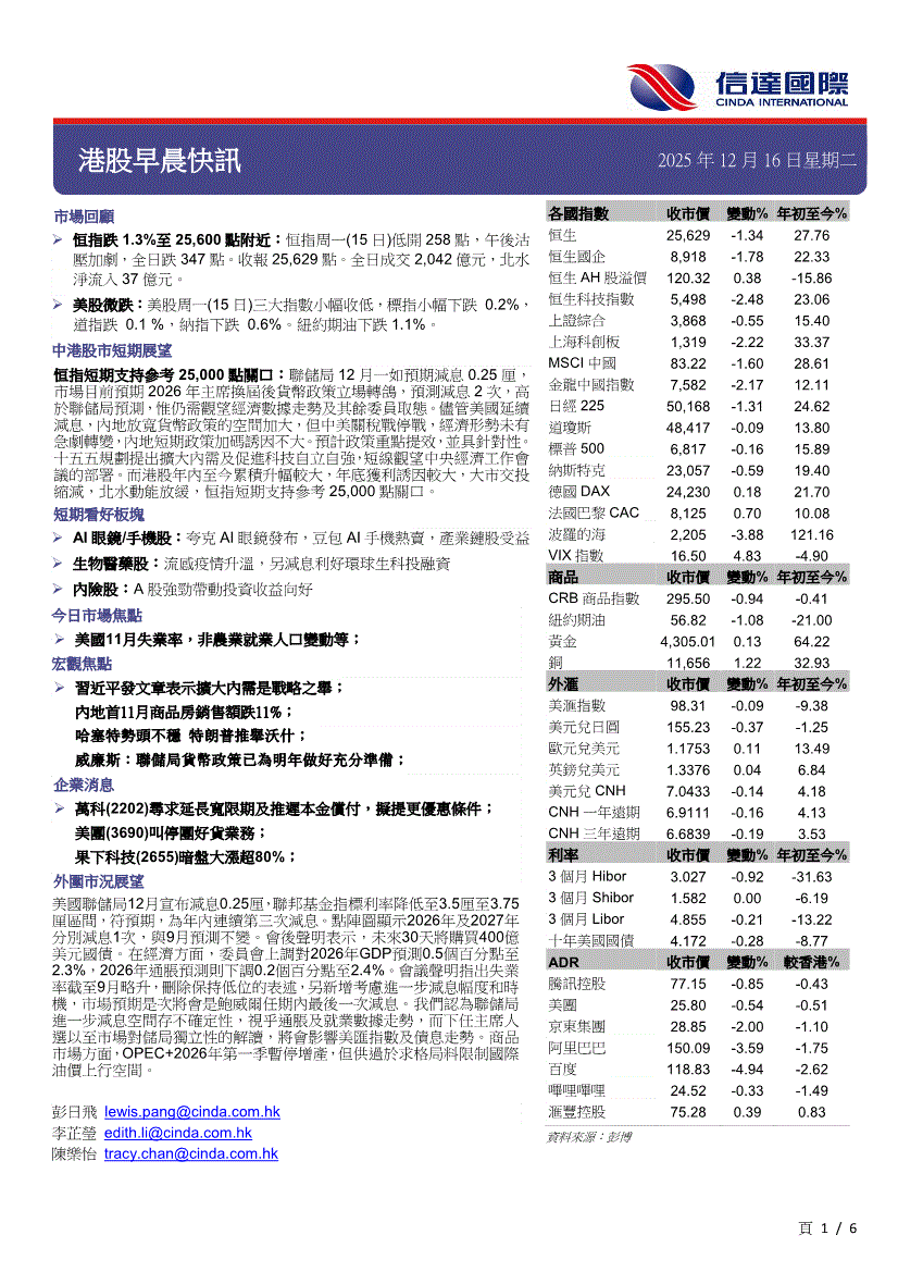 研报:信达国际-港股早晨快讯-251216