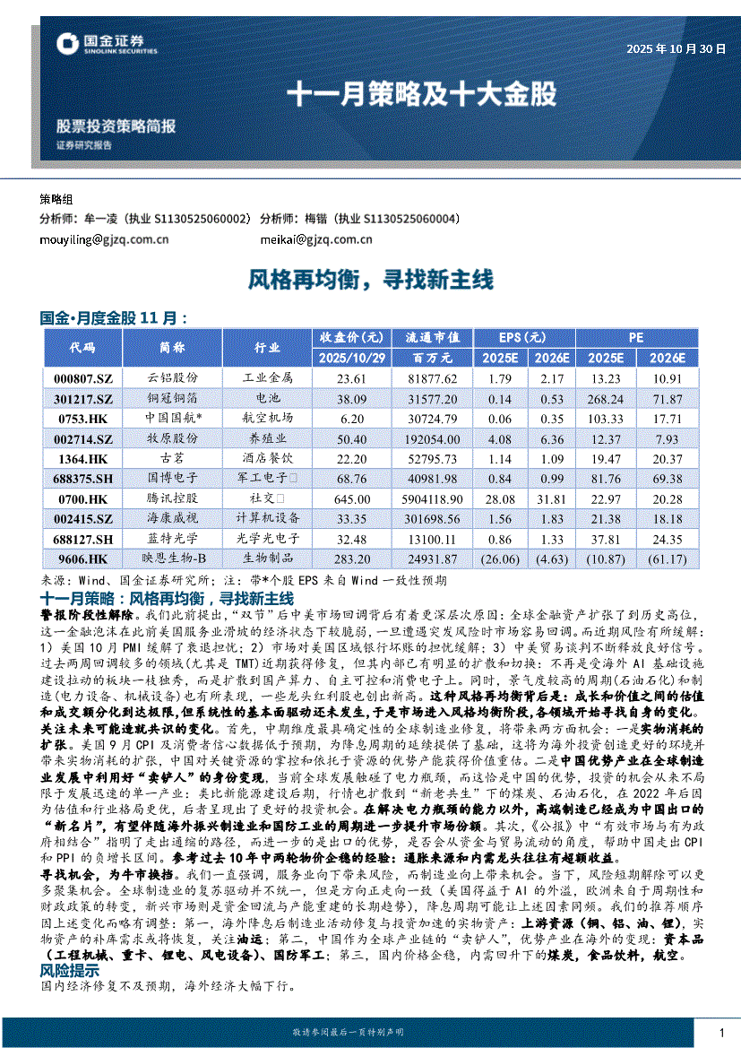 研报:国金证券-十一月策略及十大金股:风格再均衡,寻找新主线-251030
