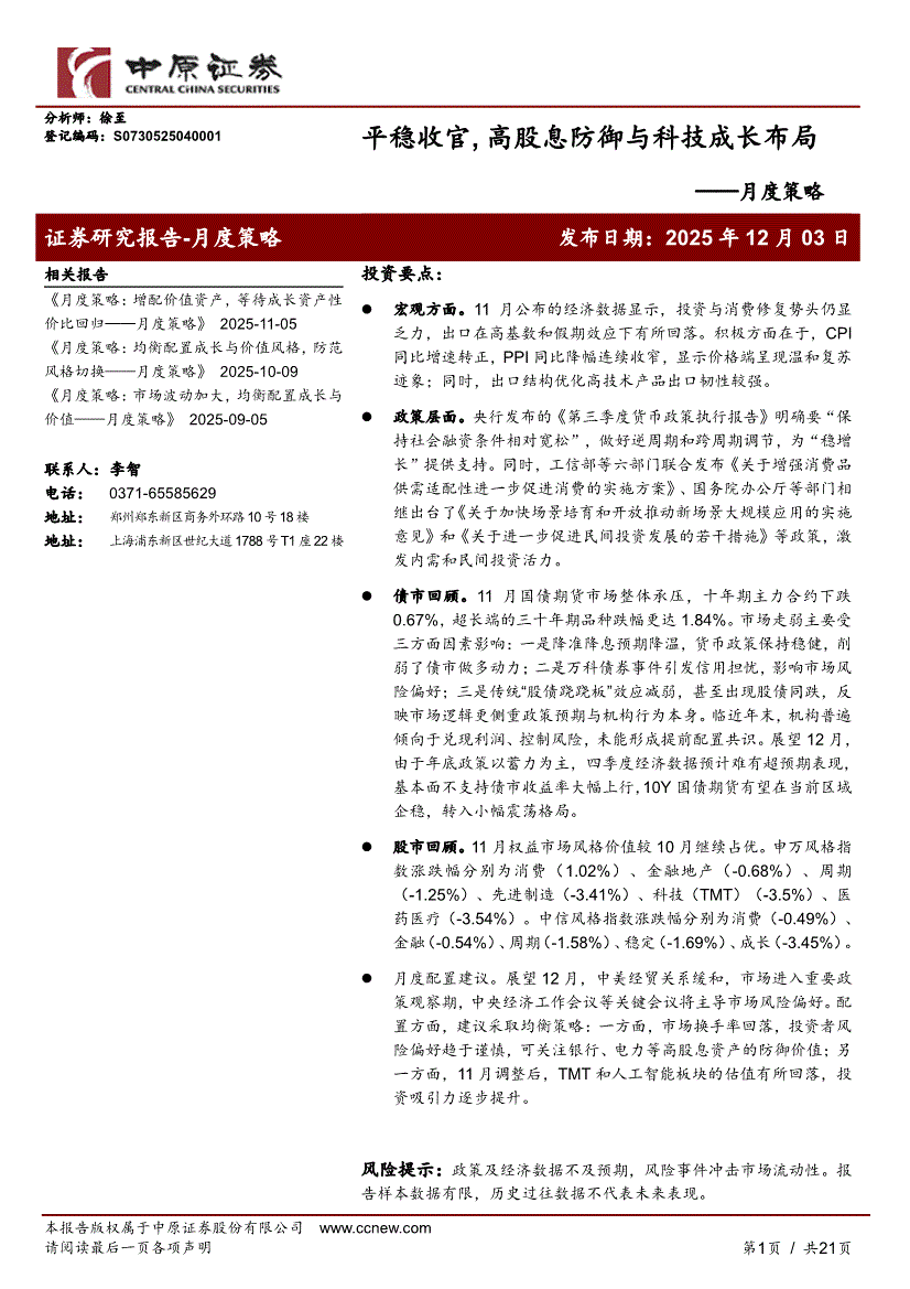 研报:中原证券-月度策略:平稳收官,高股息防御与科技成长布局-251203