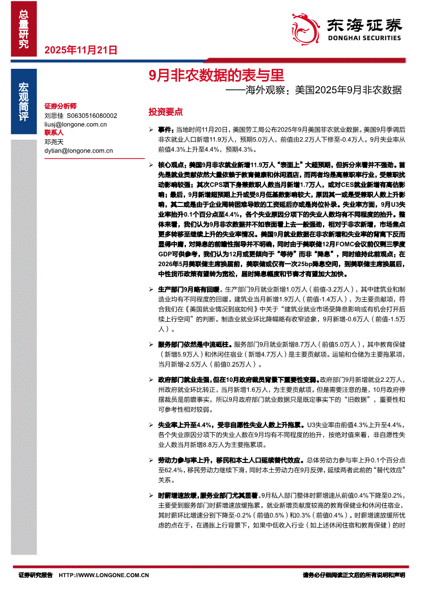 研报:东海证券-海外观察:美国2025年9月非农就业数据,9月非农数据的表与里-251121