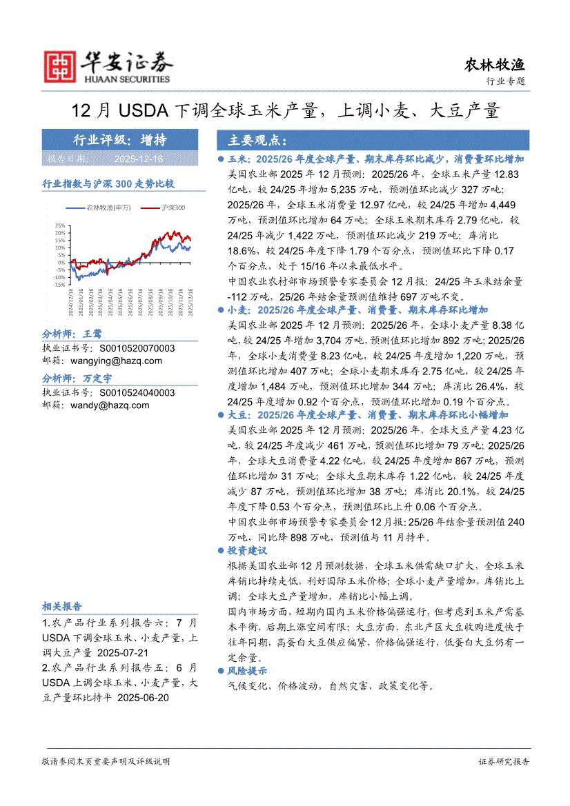 农林牧渔行业研报:华安证券-农林牧渔行业专题:12月USDA下调全球玉米产量,上调小麦、大豆产量-251216