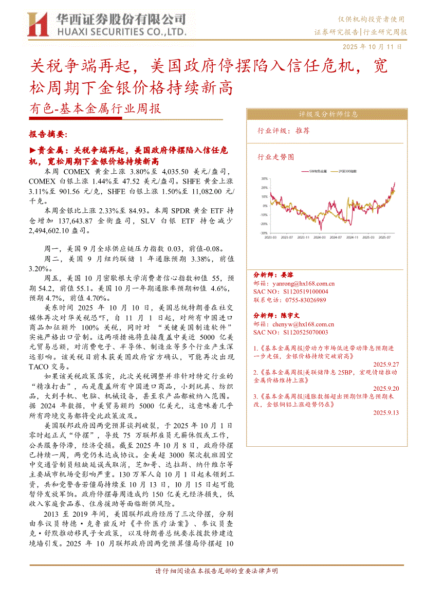 有色~基本金属行业研报:华西证券-有色~基本金属行业周报:关税争端再起,美国政府停摆陷入信任危机,宽松周期下金银价格持续新高-251011