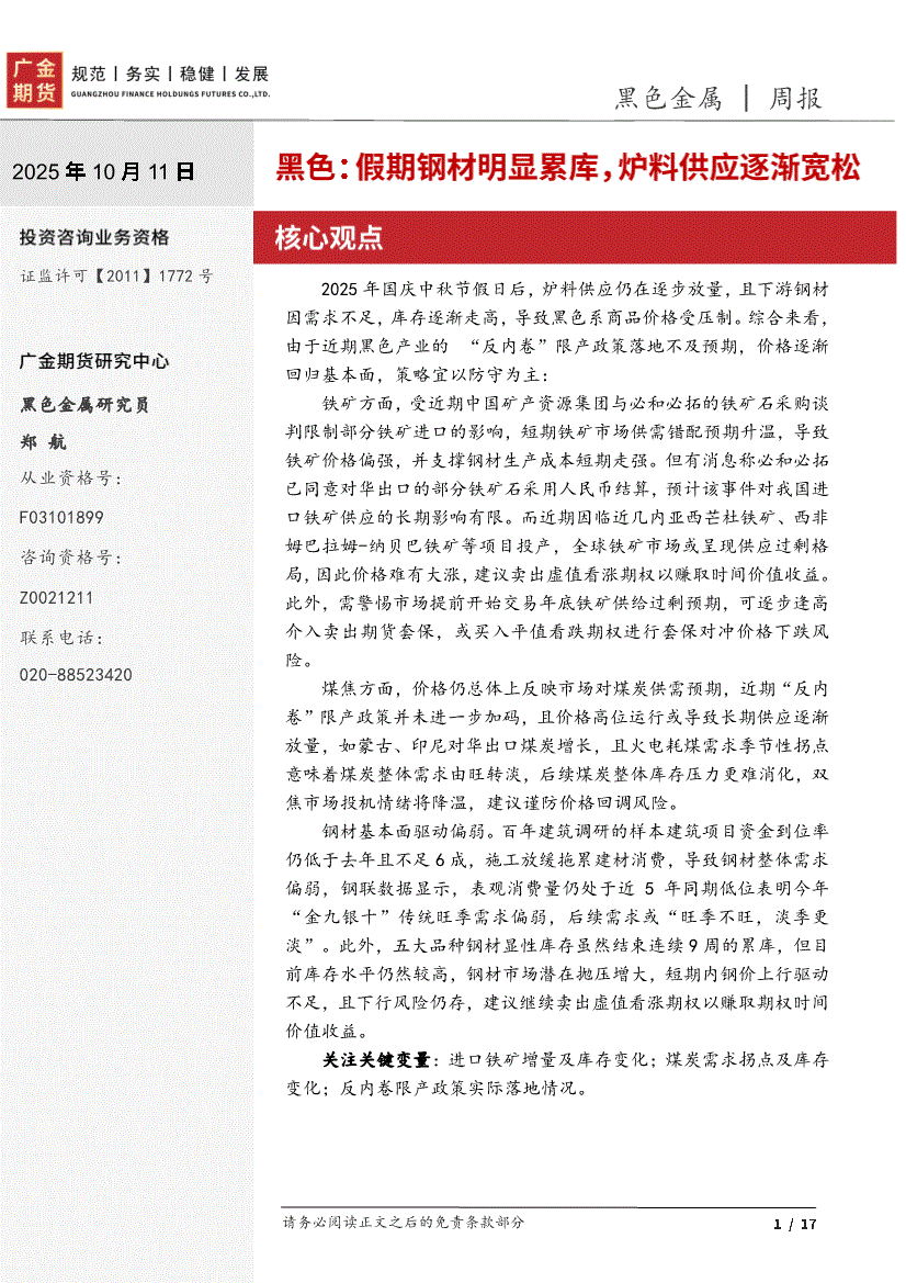 研报:广金期货-黑色:假期钢材明显累库,炉料供应逐渐宽松-251011