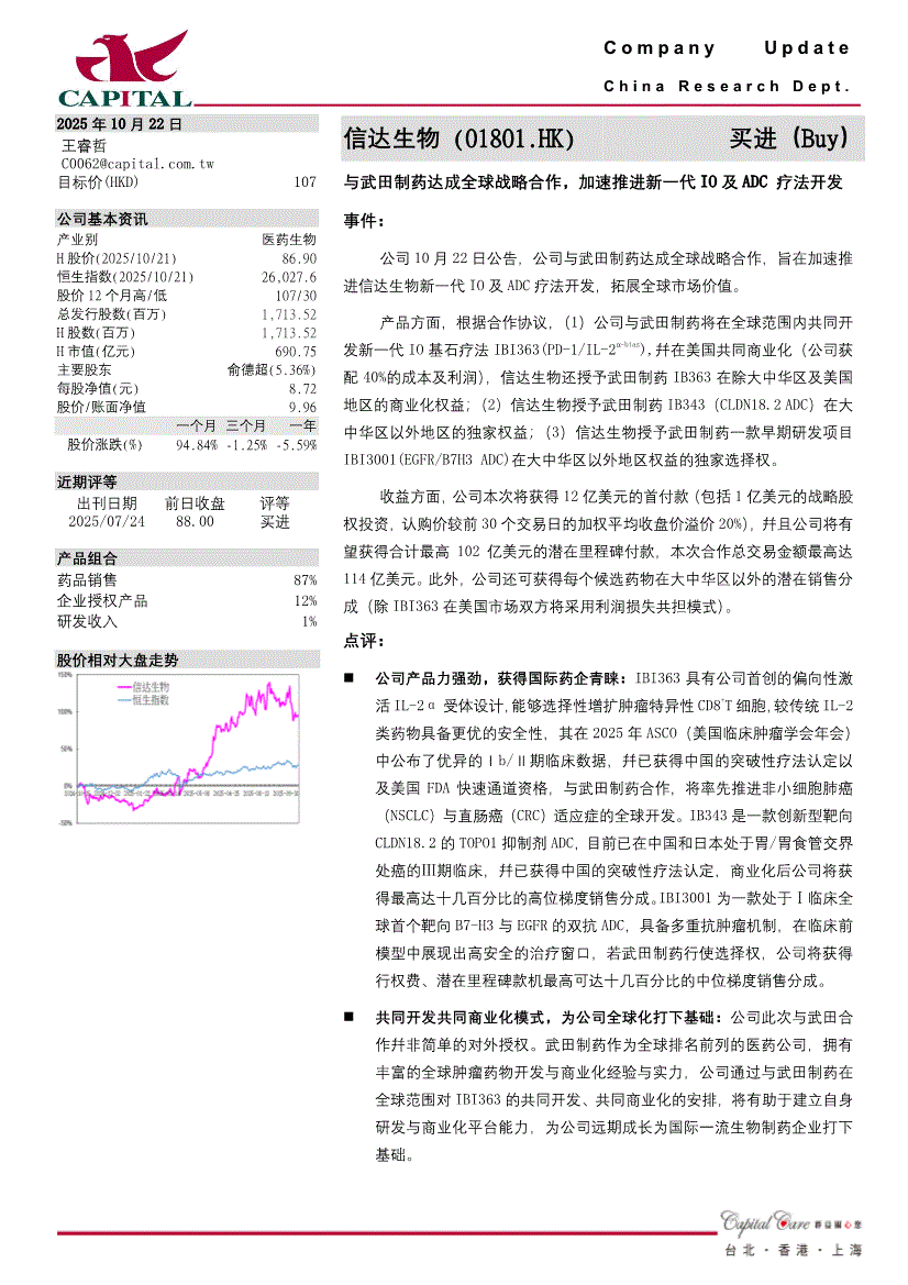 信达生物研报:群益证券(香港)-信达生物-1801.HK-与武田制药达成全球战略合作,加速推进新一代IO及ADC疗法开发-251022