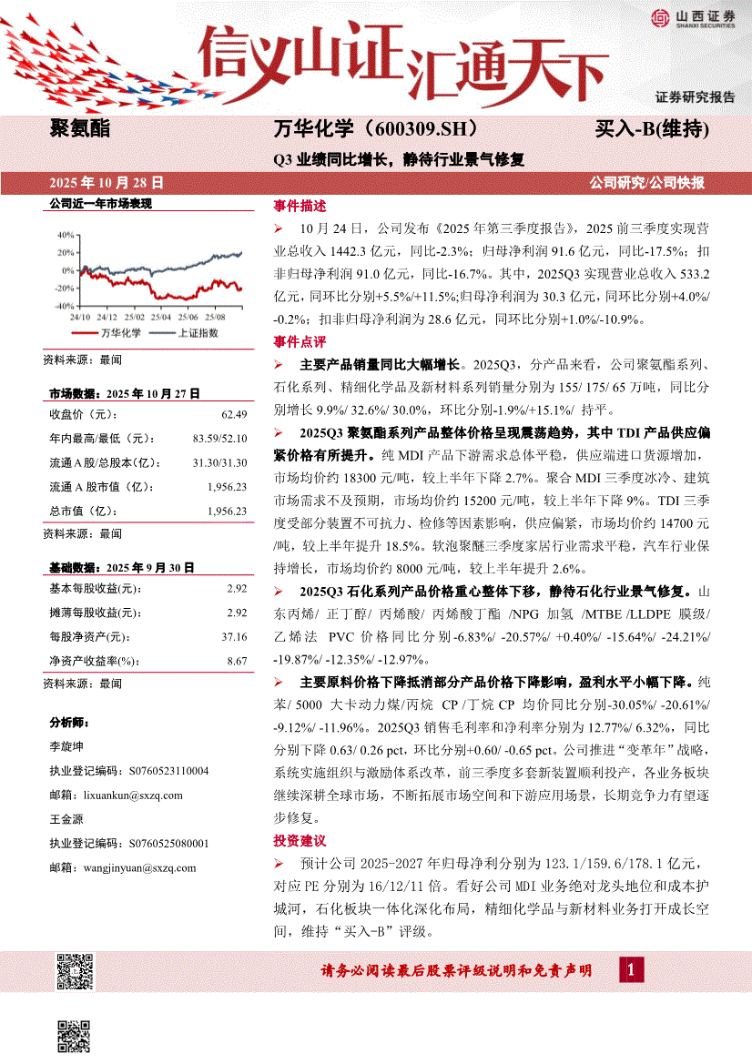 万华化学研报:山西证券-万华化学-600309-Q3业绩同比增长,静待行业景气修复-251028