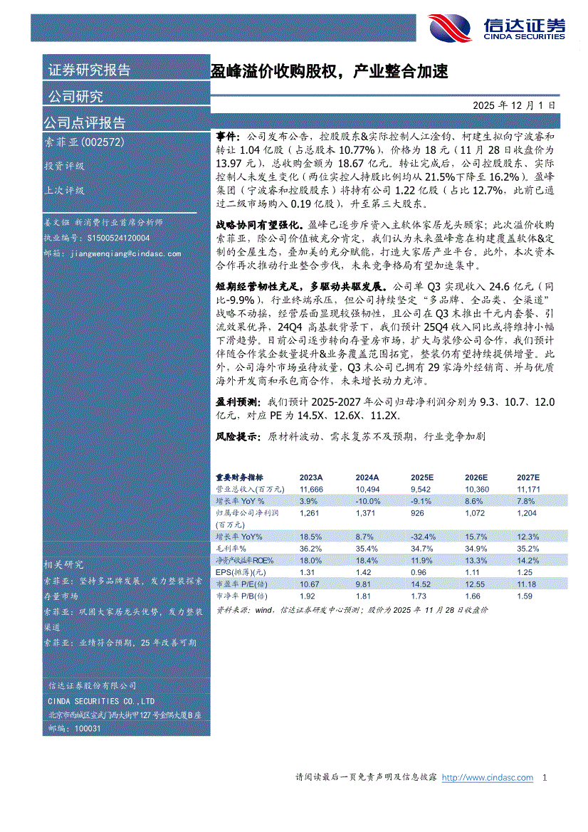 索菲亚研报:信达证券-索菲亚-002572-盈峰溢价收购股权,产业整合加速-251201
