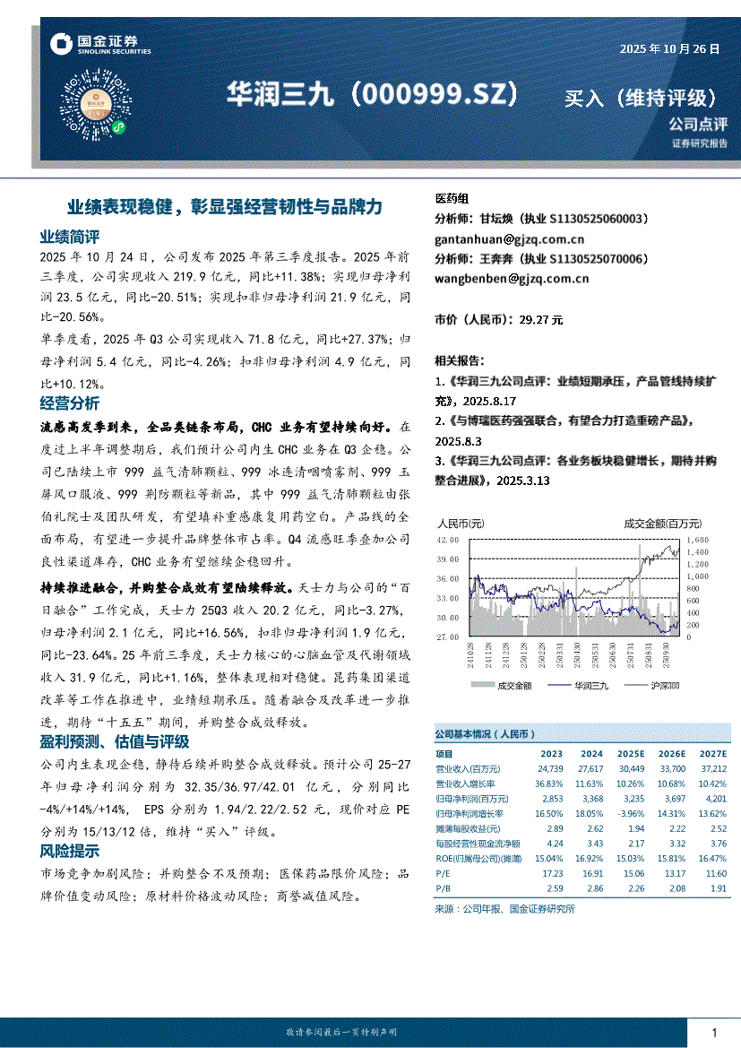华润三九研报:国金证券-华润三九-000999-业绩表现稳健,彰显强经营韧性与品牌力-251026