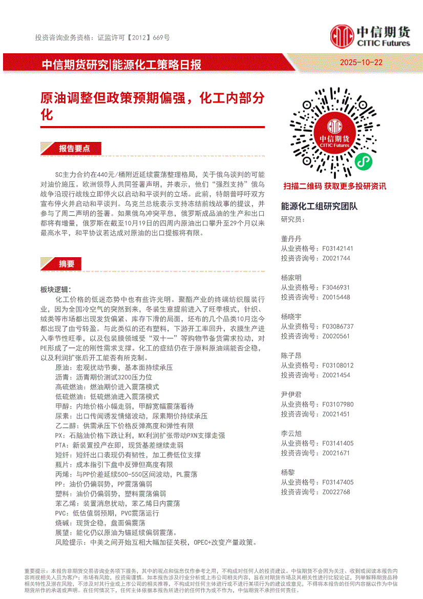 研报:中信期货-能源化工策略日报:欧洲领导人签署声明推进俄乌谈判,原油地缘溢价将回落-251022