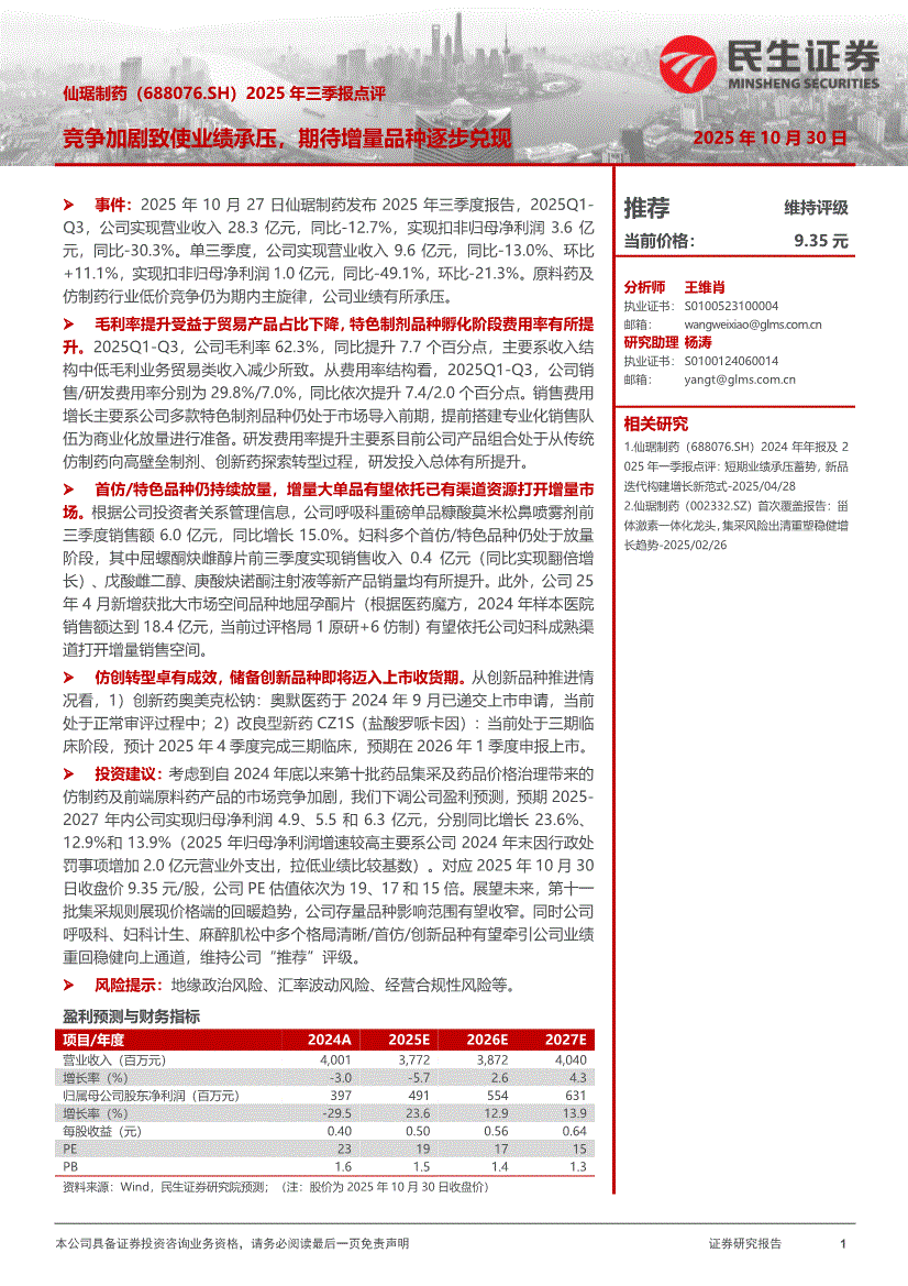 仙琚制药研报:民生证券-仙琚制药-002332-2025年三季报点评:竞争加剧致使业绩承压,期待增量品种逐步兑现-251030