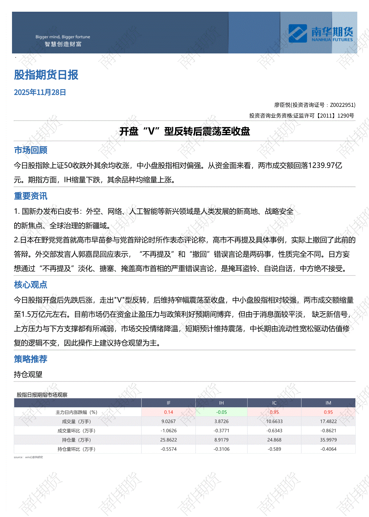 研报:南华期货-股指期货日报:开盘“V”型反转后震荡至收盘-251128