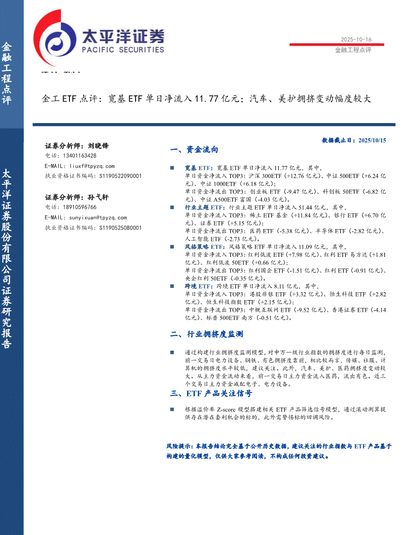 研报:太平洋证券-金工ETF点评:宽基ETF单日净流入11.77亿元;汽车、美护拥挤变动幅度较大-251016