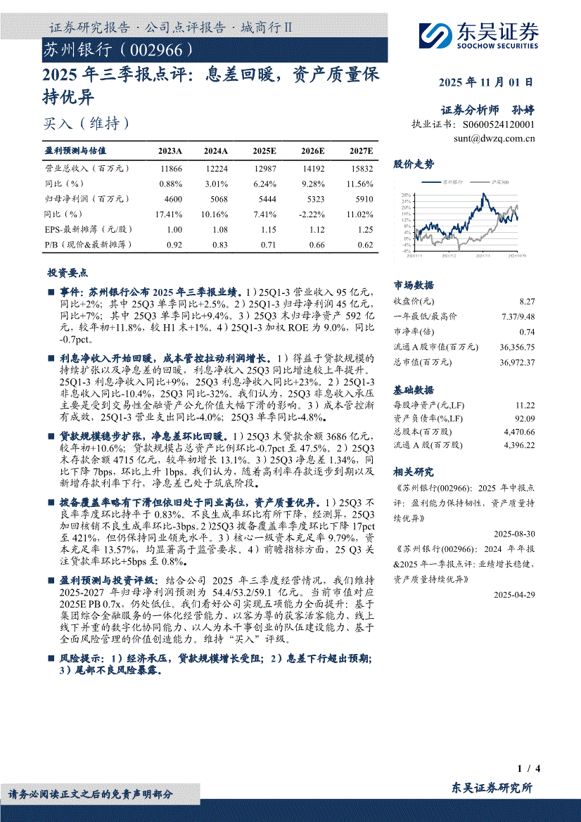 苏州银行研报:金宝搏官网188金宝搏-苏州银行-002966-2025年三季报点评:息差回暖,资产质量保持优异-251101