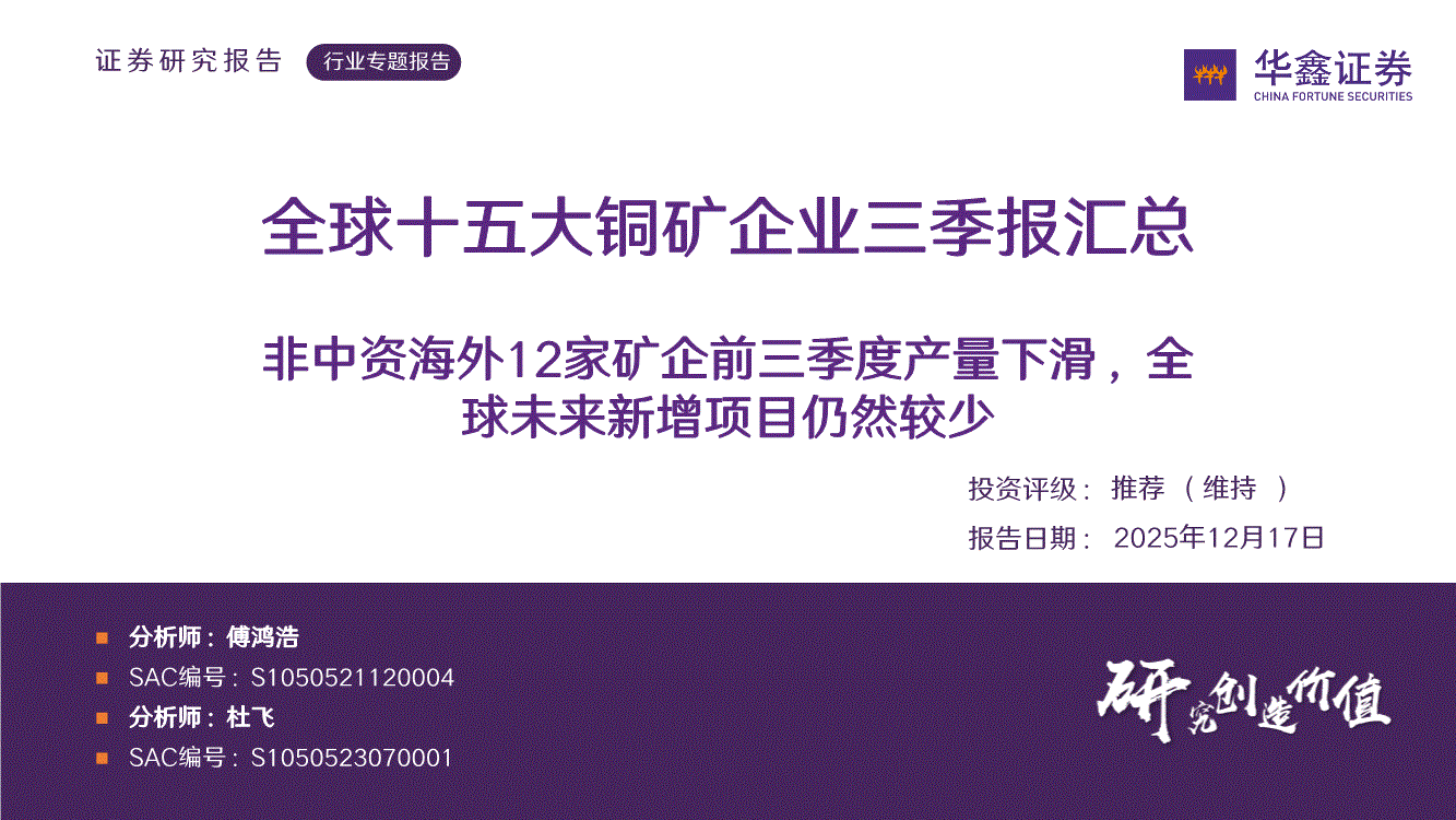 铜矿行业研报:华鑫证券-铜矿行业全球十五大铜矿企业三季报汇总:非中资海外12家矿企前三季度产量下滑,全球未来新增项目仍然较少-251217