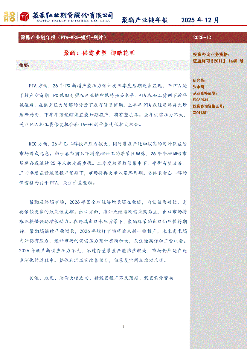 研报:弘业期货-聚酯产业链年报(PTA~MEG~短纤~瓶片)聚酯:供需重塑,柳暗花明-251216
