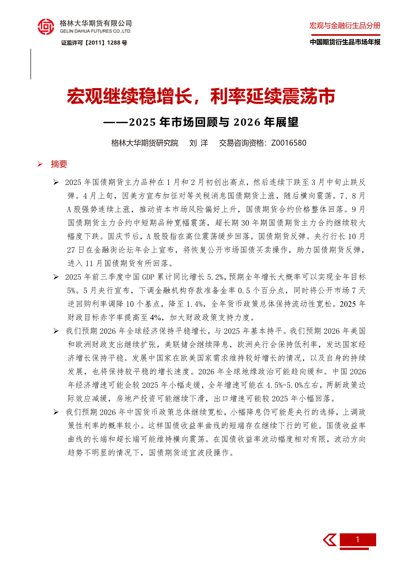 研报:格林大华期货-2025年市场回顾与2026年展望:宏观继续稳增长,利率延续震荡市-251130