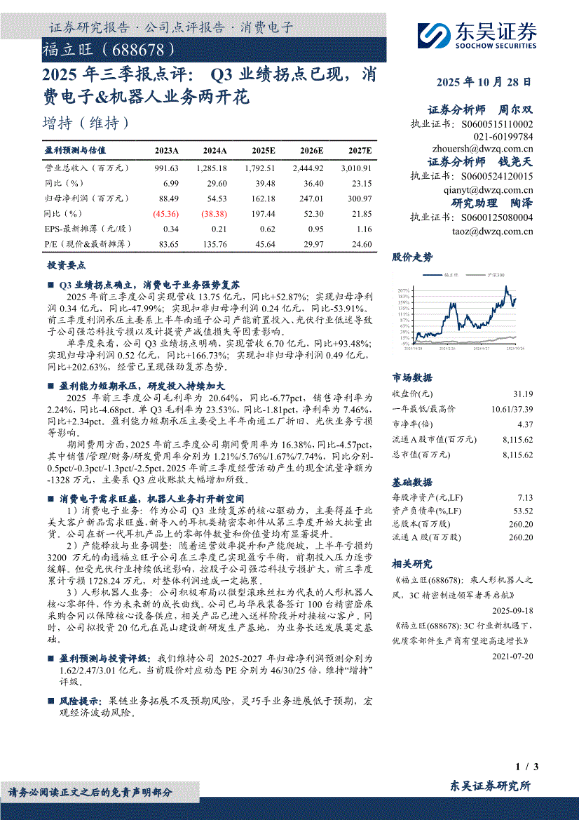 福立旺研报:金宝搏官网188金宝搏-福立旺-688678-2025年三季报点评: Q3业绩拐点已现,消费电子&机器人业务两开花-251028