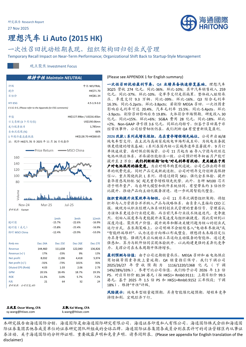 理想汽车研报:海通国际-理想汽车-2015.HK-一次性召回扰动短期表现,组织架构回归创业式管理-251127