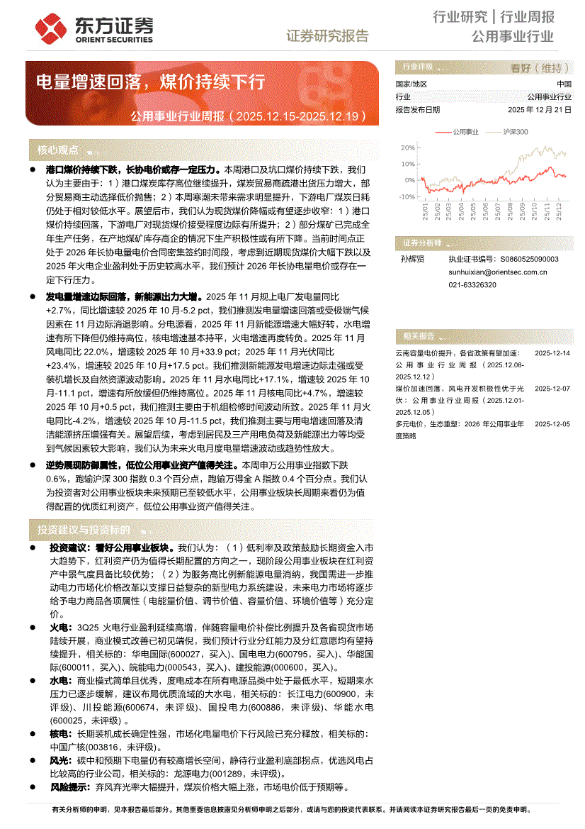 公用事业行业研报:东方证券-公用事业行业周报:电量增速回落,煤价持续下行-251221