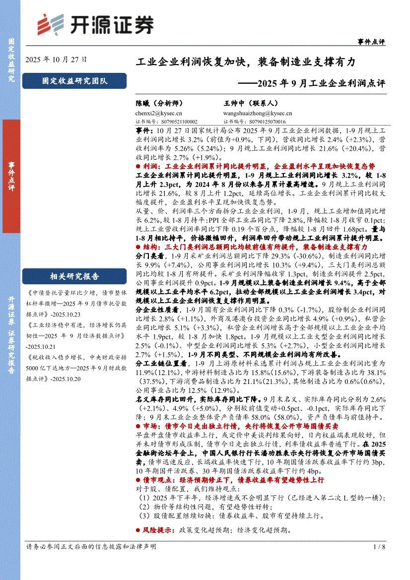 研报:开源证券-2025年9月工业企业利润点评:工业企业利润恢复加快,装备制造业支撑有力-251027