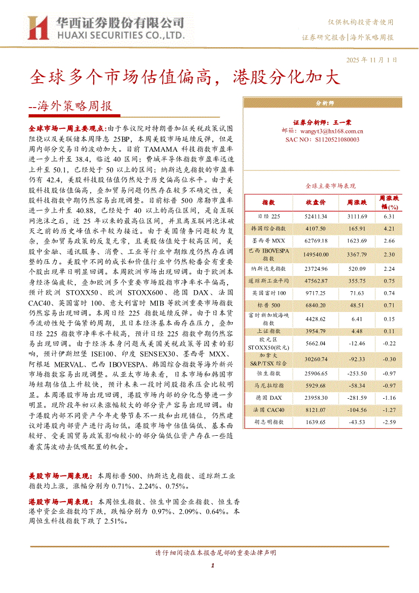 研报:华西证券-海外策略周报:全球多个市场估值偏高,港股分化加大-251101