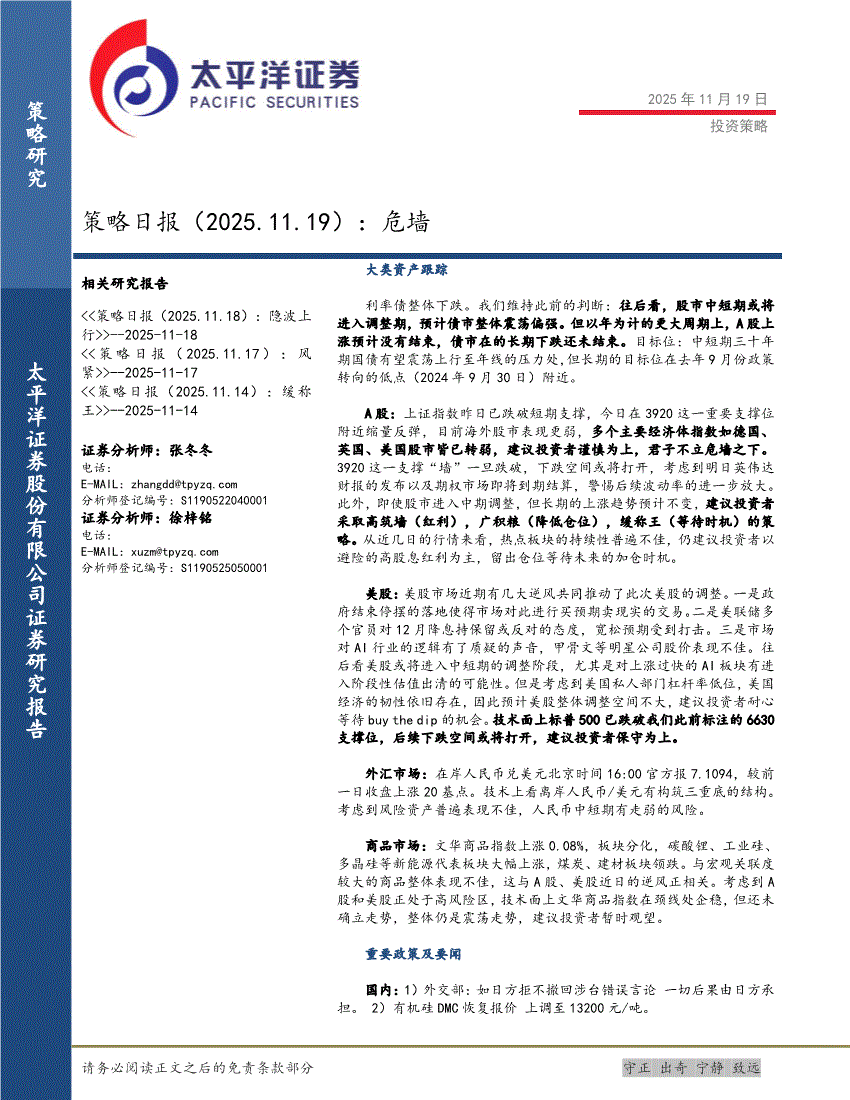 研报:太平洋证券-策略日报(2025.11.19):危墙-251119