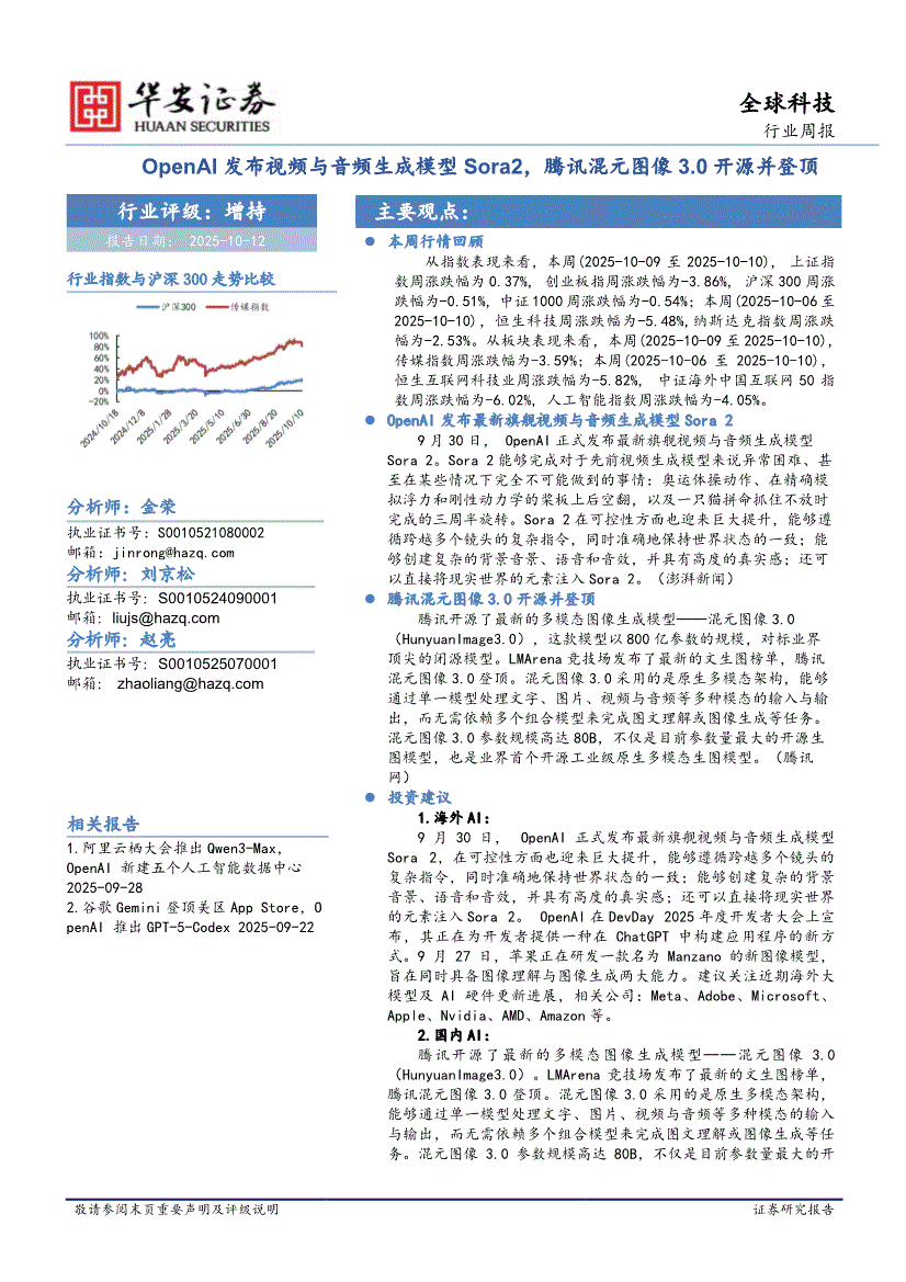 科技行业研报:华安证券-全球科技行业周报:OpenAI发布视频与音频生成模型Sora2,腾讯混元图像3.0开源并登顶-251012
