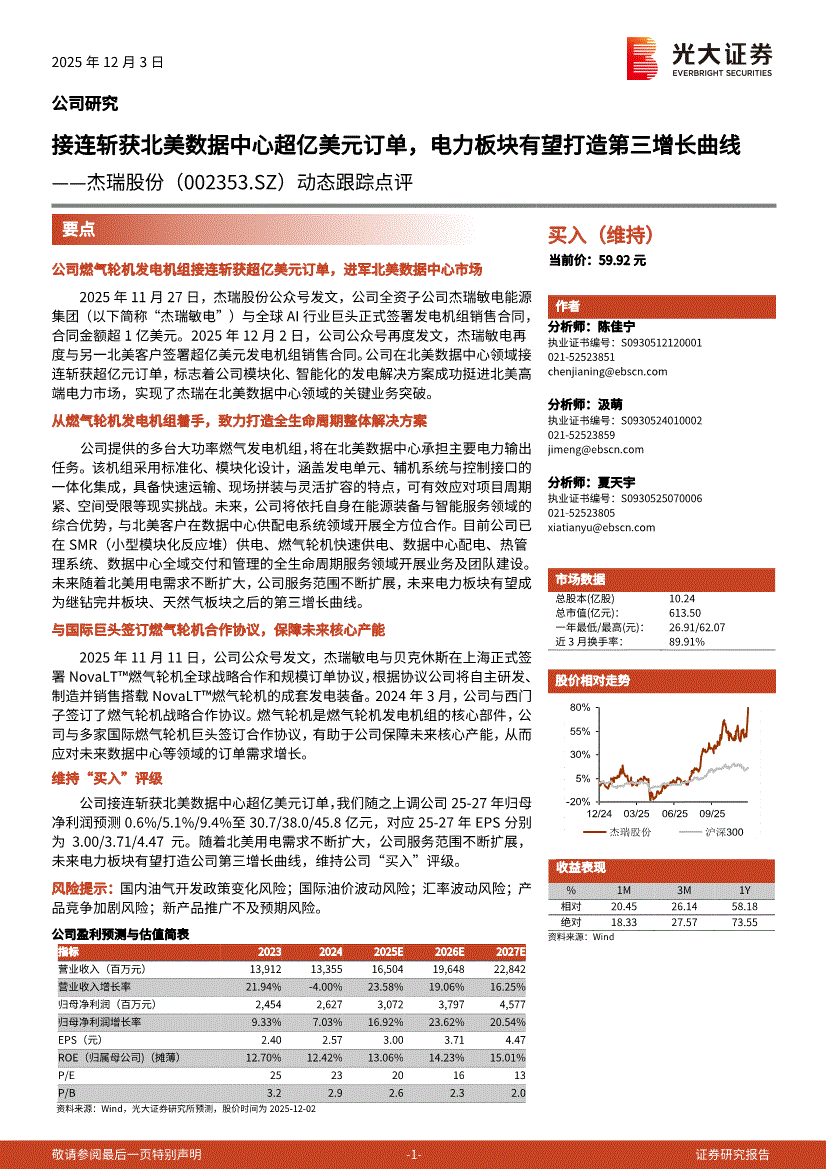 杰瑞股份研报:光大证券-杰瑞股份-002353-动态跟踪点评:接连斩获北美数据中心超亿美元订单,电力板块有望打造第三增长曲线-251203