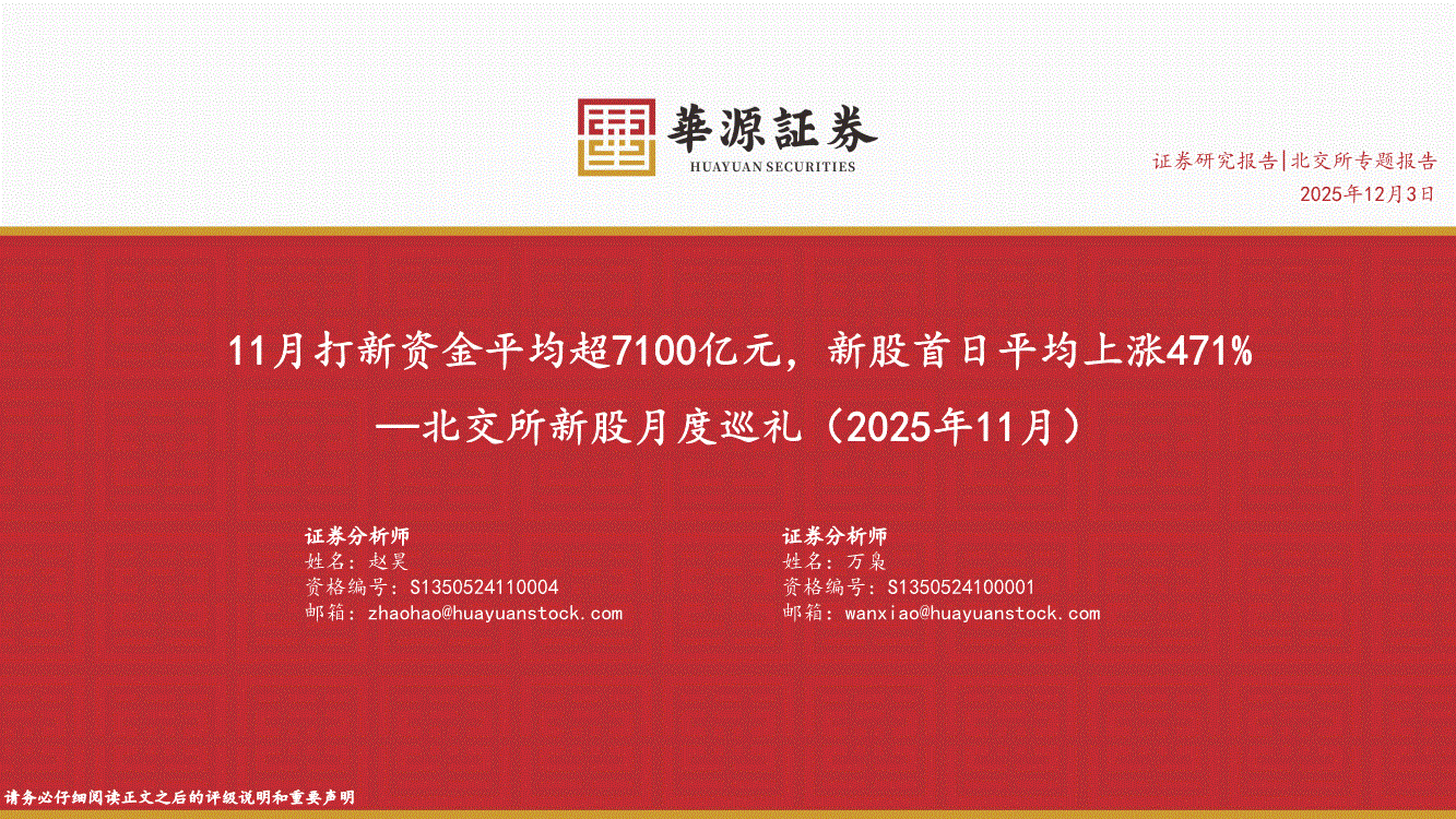 研报:华源证券-北交所新股月度巡礼(2025年11月):11月打新资金平均超7100亿元,新股首日平均上涨471%-251203