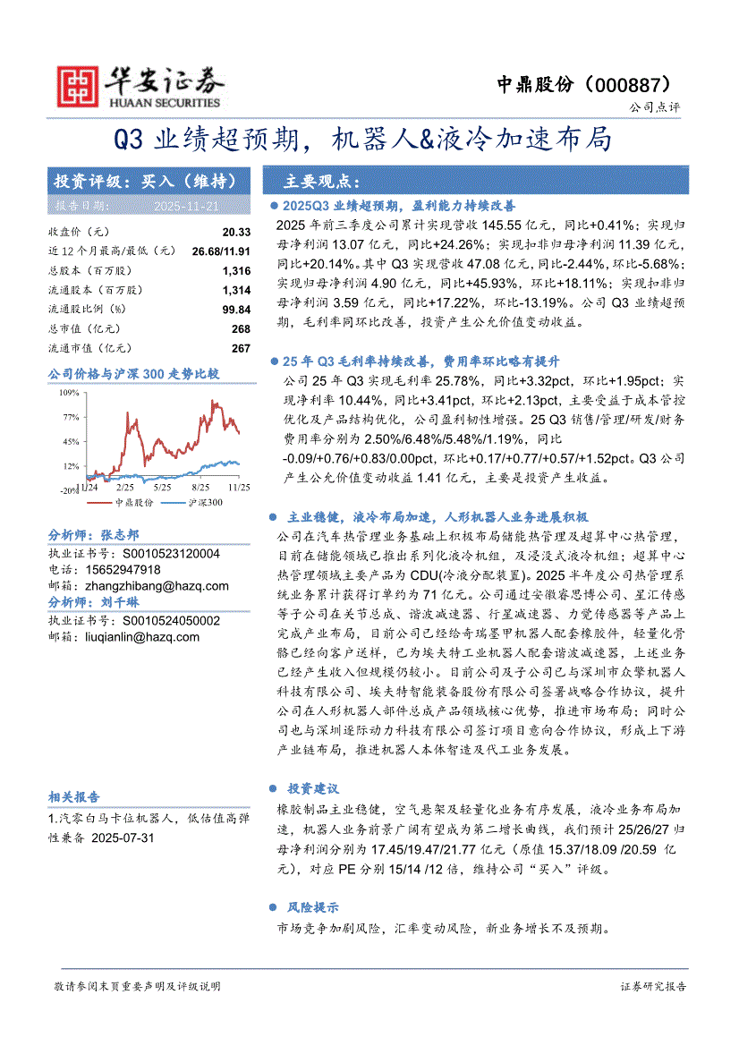中鼎股份研报:华安证券-中鼎股份-000887-Q3业绩超预期,机器人&液冷加速布局-251121