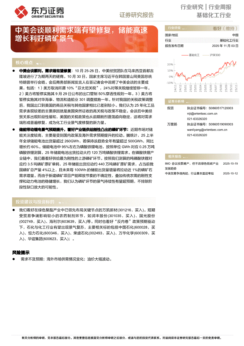 基础化工行业研报:东方证券-基础化工行业周报:中美会谈顺利需求端有望修复,储能高速增长利好磷矿景气-251103