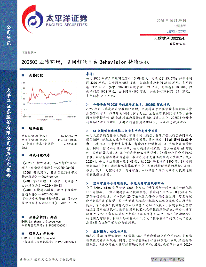 天娱数科研报:太平洋证券-天娱数科-002354-2025Q3业绩环增,空间智能平台Behavision持续迭代-251029