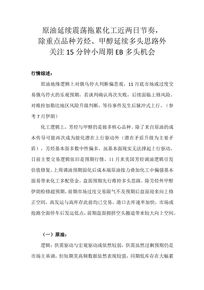 天富期货-原油延续震荡拖累化工近两日节奏,除重点品种芳烃、甲醇延续多头思路外关注15分钟小周期EB多头机会-251203
