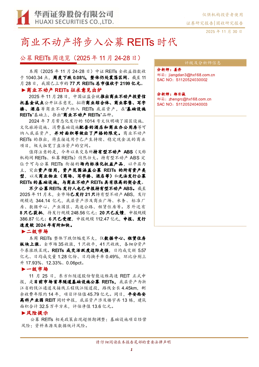 研报:华西证券-公募REITs周速览(2025年11月24~28日):商业不动产将步入公募REITs时代-251130