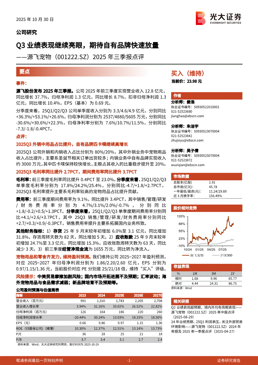源飞宠物研报:光大证券-源飞宠物-001222-2025年三季报点评:Q3业绩表现继续亮眼,期待自有品牌快速放量-251030