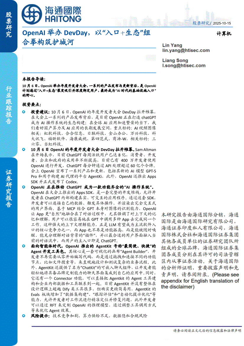 计算机行业研报:海通国际-计算机行业:OpenAI举办DevDay,以“入口十生态”组合拳构筑护城河-251015