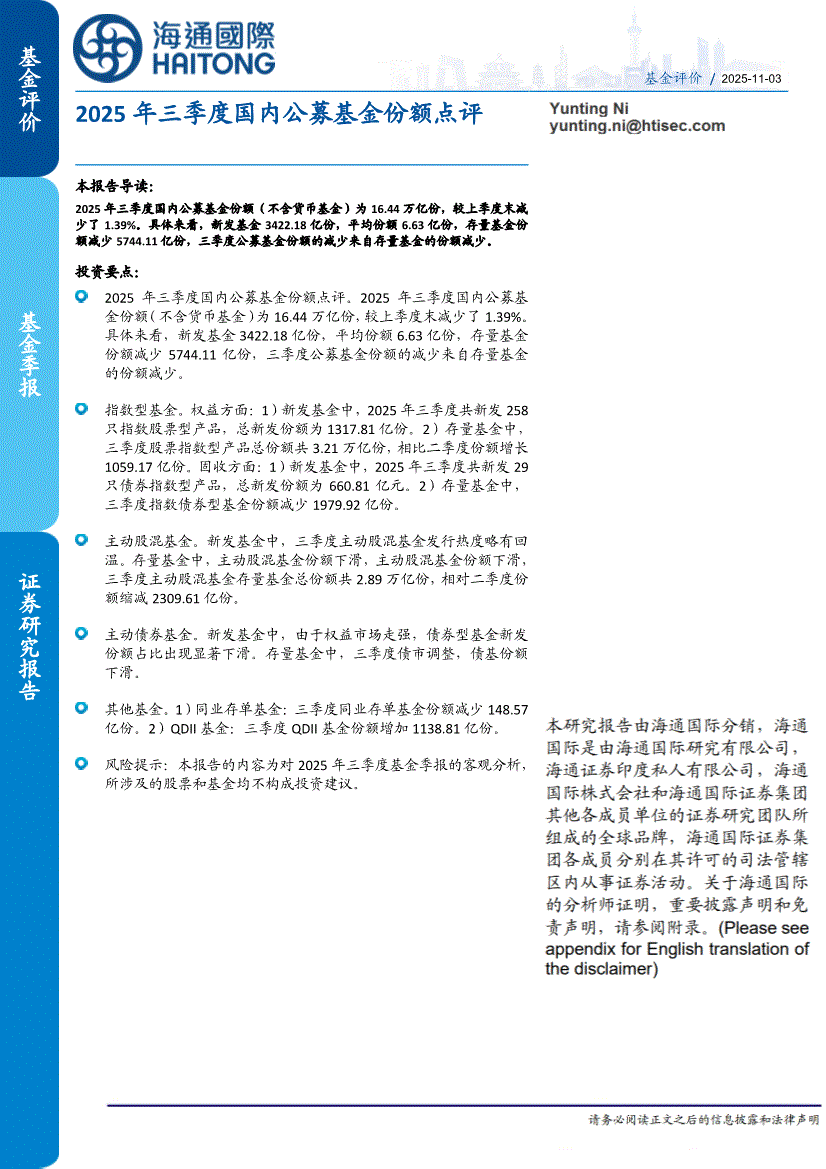 研报:海通国际-2025年三季度国内公募基金份额点评-251103